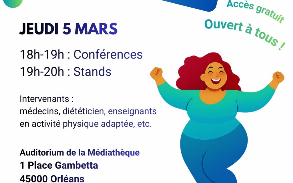 A Orléans, jeudi 5 mars 2026, le Centre Spécialisé d’Orléans propose des conférences animées par un médecin, un diététicien et un enseignant en activité physique adaptée et des stands pour échanger avec les professionnels. L’événement se déroule de 18h à 20h, à l’auditorium de la médiathèque d’Orléans.